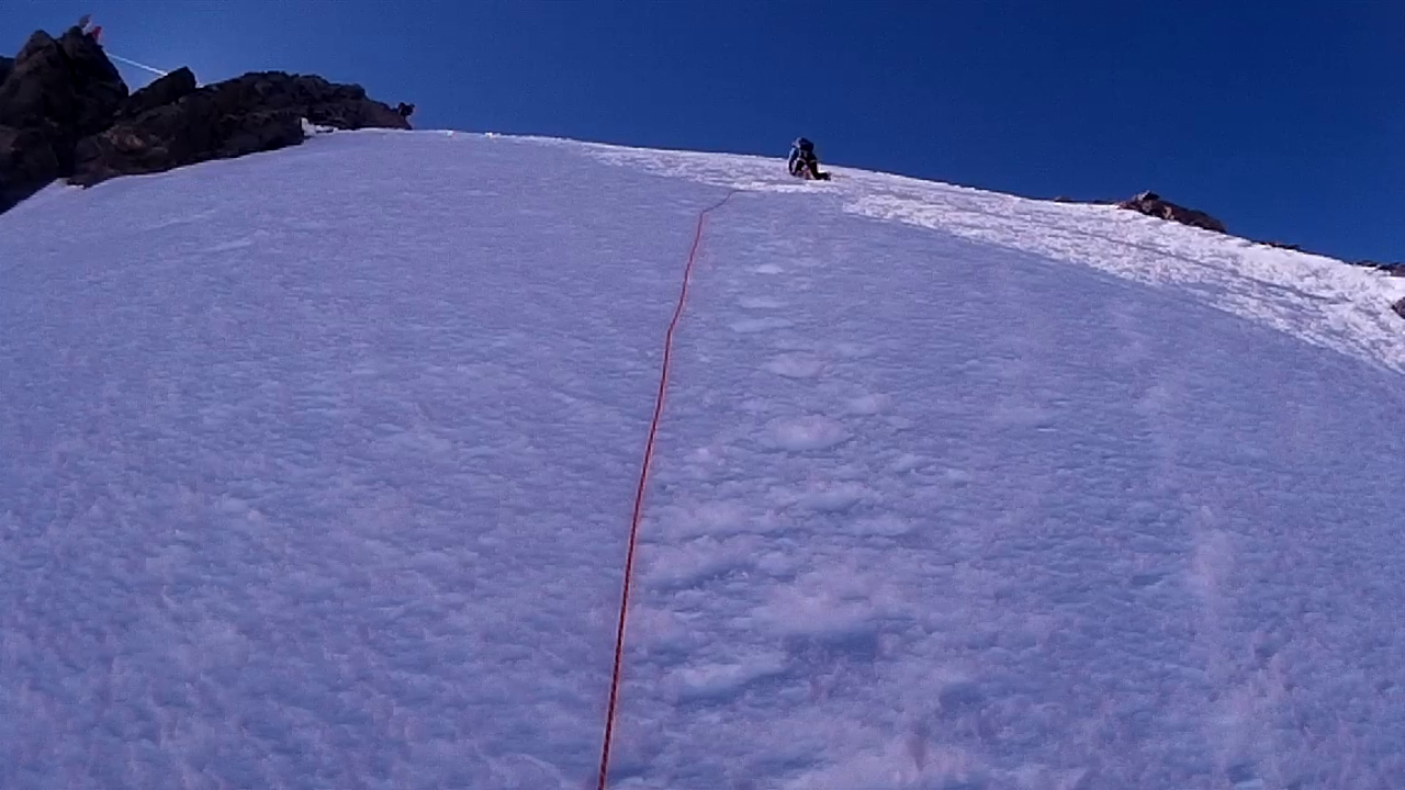 Ai piedi del suo lungo scivolo nevoso (pendenza media 50°) guardo con timore reverenziale quello che mi spetta: l'ascesa a questa bellissima piramide di roccia e ghiaccio, che si erge quasi a voler sfidare il cielo, non sarà per niente banale... almeno per me!Alberto mi spiega brevemente come avverrà la nostra progressione e poi, piccozza alla mano, inizia a risalire i 40 metri di neve ghiacciata che conducono alla sottile cresta sommitale a picco sull'alta Val Sesia: la corda si tende, è il mio turno...