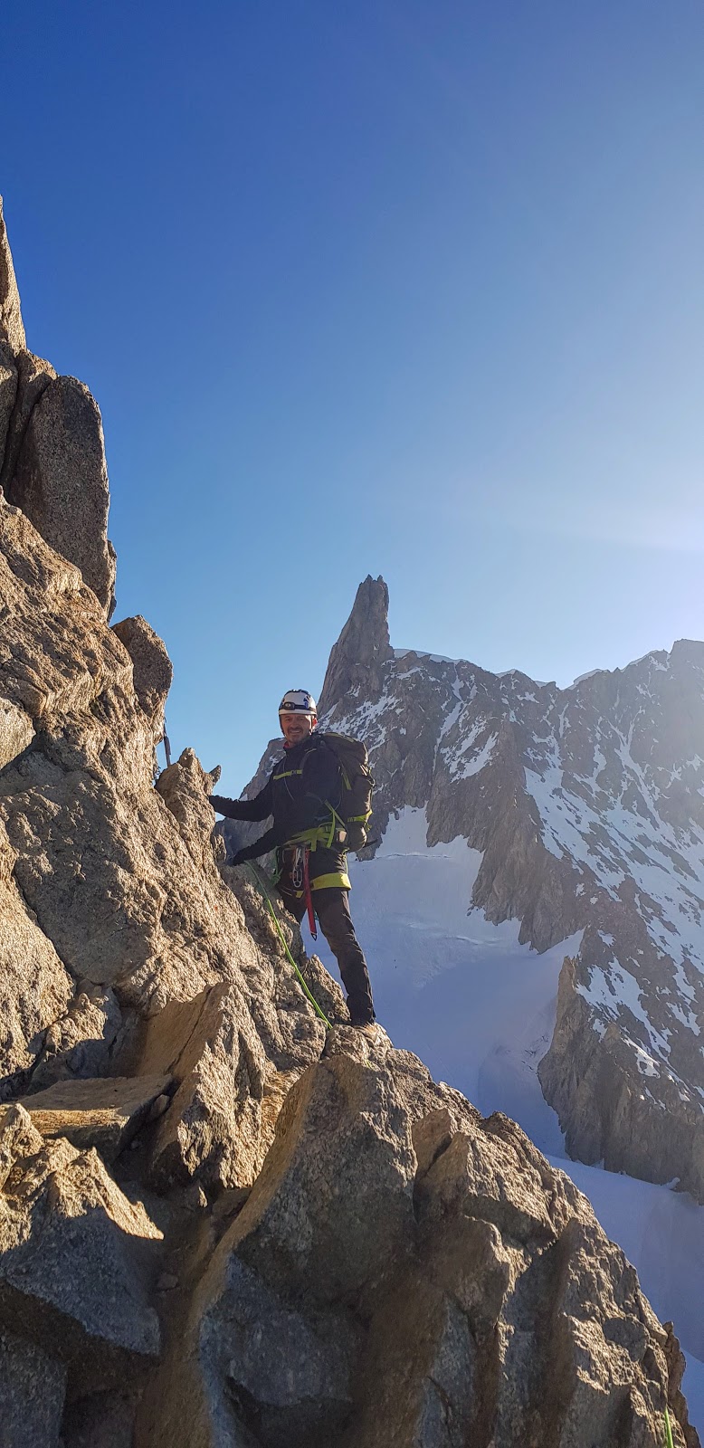 In cresta, sullo sfondo il Dente del Gigante (4013m). Grazie della foto ad Andrea.